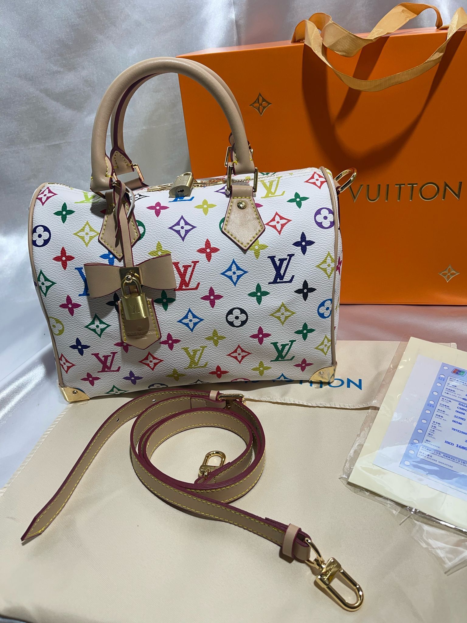 La borsa Deauville in tela Monogram Multicolore Bianca di Louis Vuitton è un accessorio di lusso che unisce eleganza, praticità e il celebre design della maison francese. Realizzata in tela Monogram, con la distintiva combinazione di colori vivaci su fondo bianco, questa borsa rappresenta una versione fresca e moderna del tradizionale Monogram, offrendo un tocco di originalità e raffinatezza. La borsa Deauville è perfetta per chi cerca un prodotto spazioso e funzionale. Il design ampio e ben organizzato offre molto spazio per gli oggetti quotidiani, come il portafoglio, il telefono, la bottiglia d'acqua e altri accessori, mantenendo un aspetto elegante e ordinato. Inoltre, le maniglie in pelle e la tracolla regolabile offrono diverse opzioni di trasporto, permettendo di indossarla comodamente sia a mano che a spalla. Il logo Louis Vuitton è ben visibile sulla parte frontale, aggiungendo un tocco di lusso discreto, mentre i dettagli in pelle e i metalli dorati conferiscono un look sofisticato. La borsa Deauville è ideale per chi cerca un accessorio di alta qualità, che sappia unire praticità e stile, perfetto per un utilizzo quotidiano o per le occasioni speciali.
